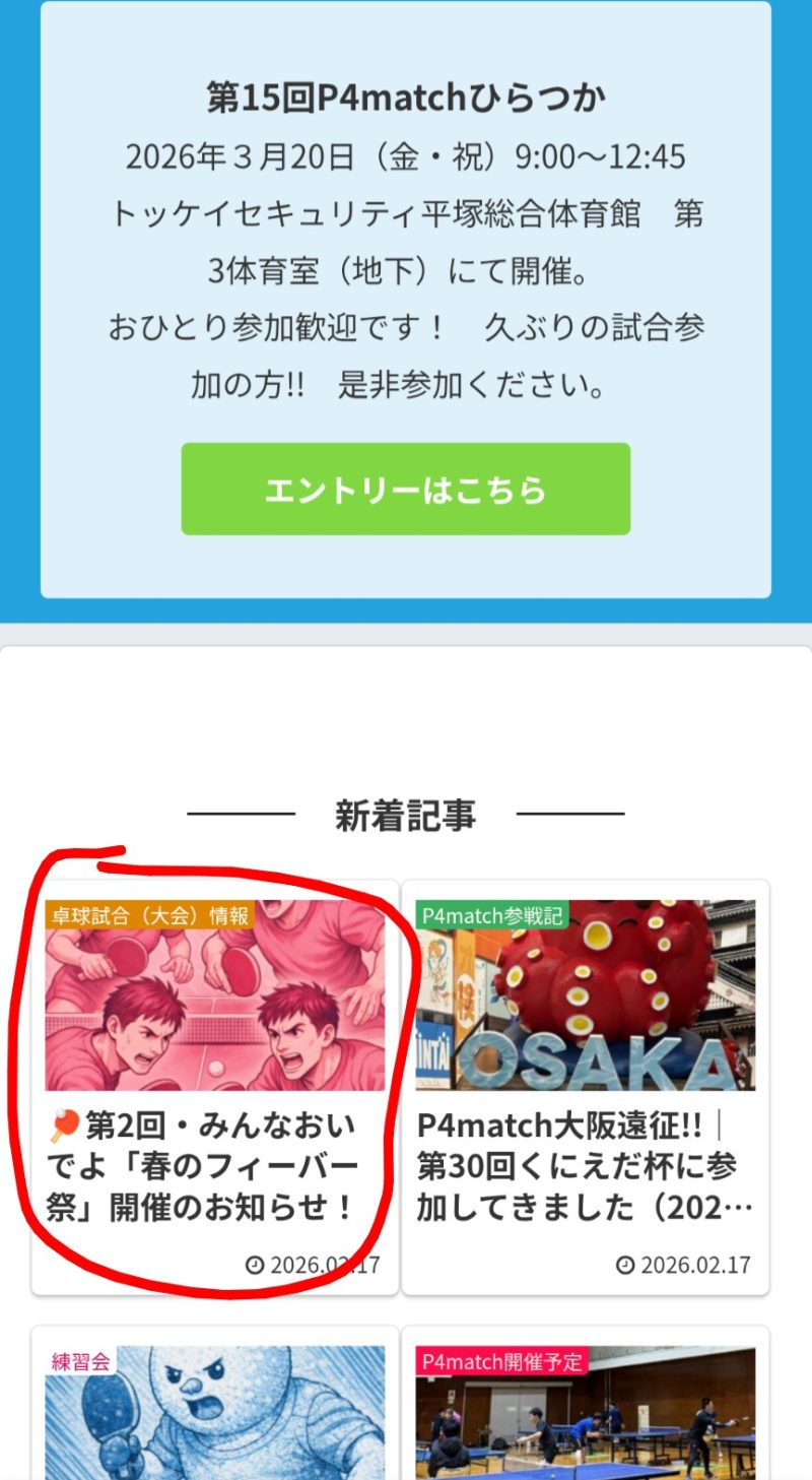 コチラのサイトでは今、卓球界で話題のP4マッチの告知や参加した際の記事、その他に地方の試合情報や県外の試合情報など…